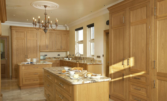 Oak kitchen furniture with quarter sawn crossbanded inlays and figured panels