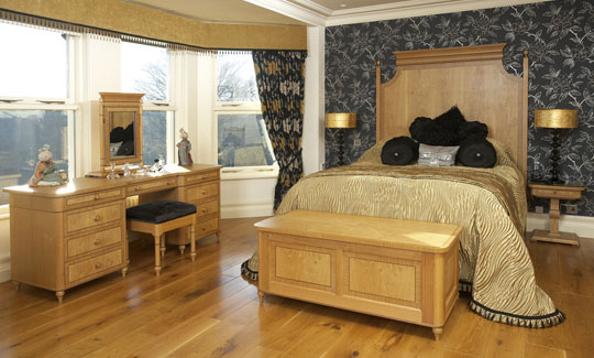 Oak bedroom furniture with quarter sawn oak crossbandings and walnut inlays