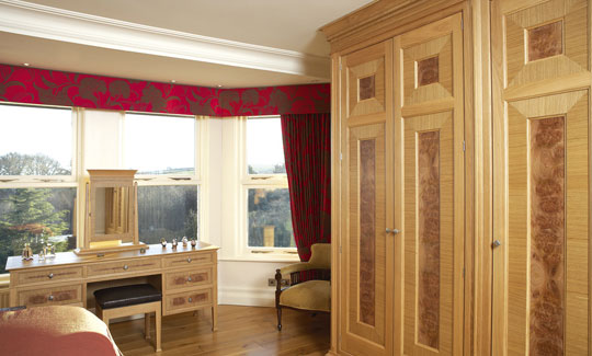 Fitted and freestanding bedroom furniture in quarter sawn oak with wavy elm centre panels