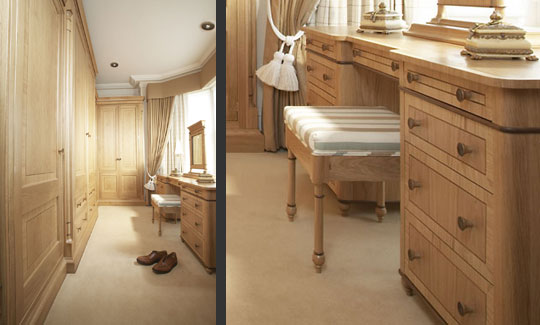 Fitted and freestanding bedroom furniture in oak with walnut inlays
