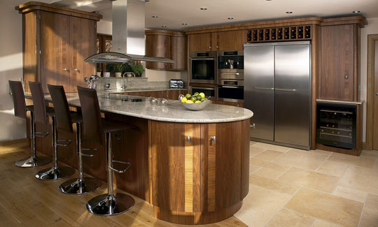Contemporary kitchen furniture in crown cut and quarter sawn black walnut with polished solid britannium door & drawer pulls