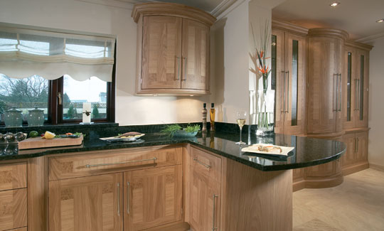Classic contemporary kitchen furniture in crown cut and quarter sawn oak with burr oak inlays and solid britannium door & drawer pulls
