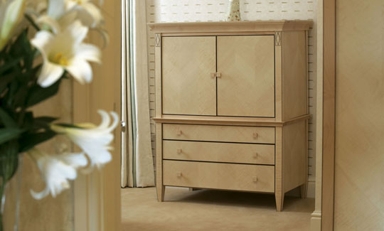 Freestanding bedroom furniture in ripple sycamore with black walnut inlays